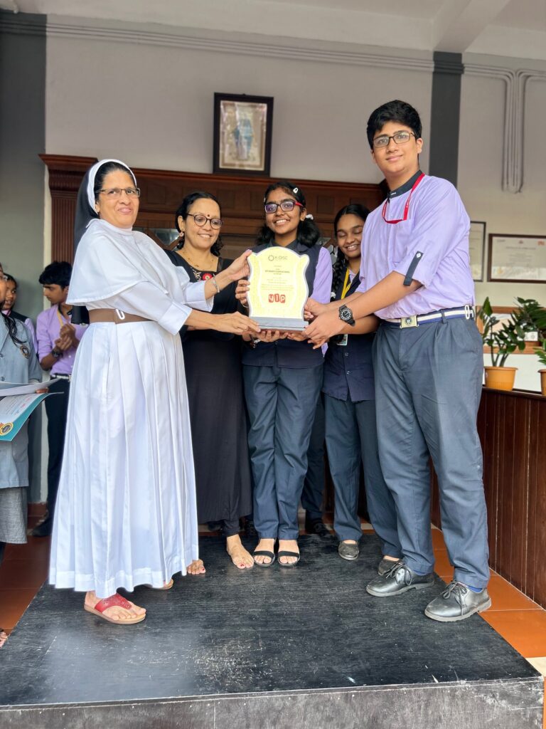 Neal Santhosh, Arshya Koushithraj, Srishti Vineet were honoured along with the mentor Mrs. Shanila K for receiving Trophy, which they received from K-DISC session at Kottarakara, during the morning assembly in recognition of YIP 3.0 performance in the State Leavel.